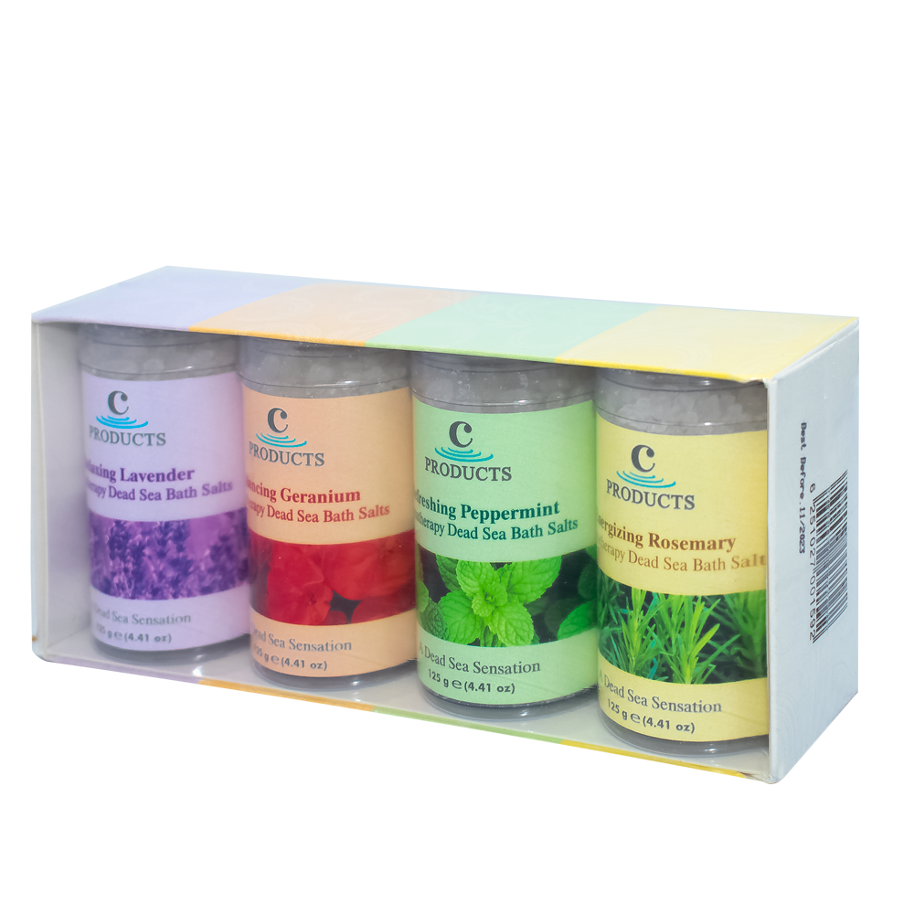 An elegant gift box containing a collection of 4 different exotic blends of aromatherapy oils with Dead Sea salts which come in handy single use size containers so that you can enjoy the entire selection. This includes: