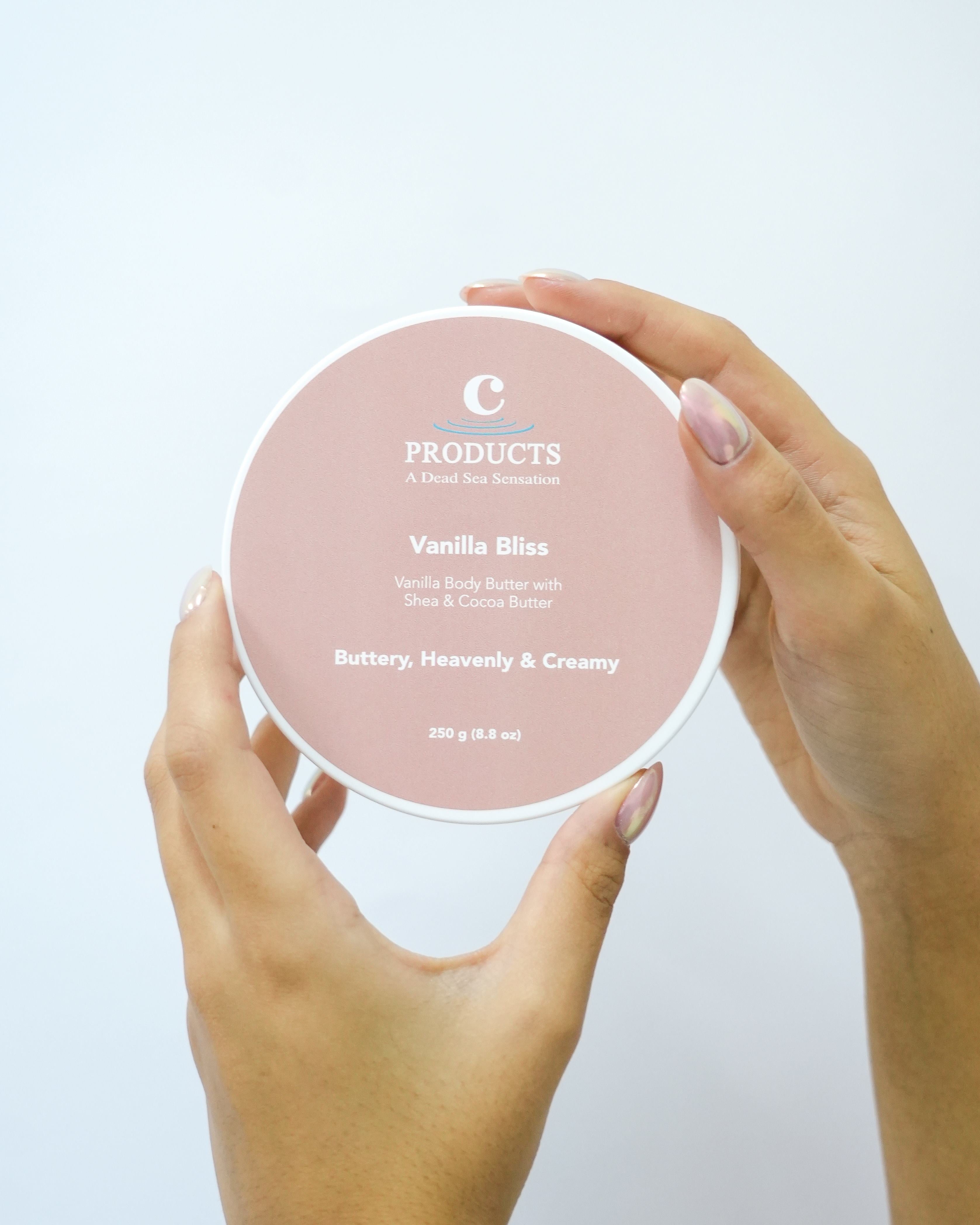Aqua, Isopropyl myristate, Stearic acid, Cetyl alcohol, Caprylic / Capric triglyceride,Glycerin, Dimethicone, Polysorbate 60, Sorbitan stearate, Theobroma cacao (Cocoa) seed butter, Butyrospermum parkii (Shea) butter,Tocopheryl acetate (Vitamin E), Maris sal (Dead Sea Salt), Phenoxyethanol, Caprylyl glycol, Sorbic acid, Butylphenyl methlpropional, Cinnamyl alcohol, Citronellol, Geraniol, Linalool, CI 20285, CI 19140, Parfum